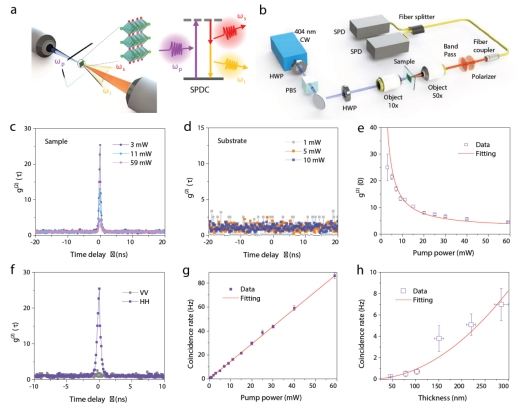 合作者们进一步测试了多层NbOCl2二维材料的自发参量下转换过程。实验中采用404 nm波长的连续激光器(最大泵浦功率59 mW)泵浦二维材料,收集下转换过程所产生的808 nm附近波长参量光。二阶关联函数g(2)测试结果远远超过2,证明该过程产生了非经典关联的光子对。合作者们也对参量光信号强度随二维材料厚度变化关系进行了测量,实验结果和理论预期完全吻合。值得注意的是:实验中证实厚度低至46 nm的该材料也能制备量子光源,这是目前国际报道的最薄的非线性量子光源。这项研究不仅为光学量子信息研究提供了一种可集成的量子光源,也为二维材料的非线性研究开辟了一个新的方向。