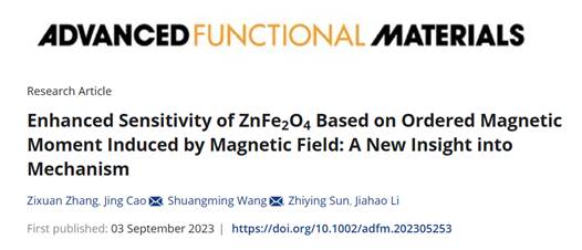 太阳成集团tyc151cc曹静课题组近期在《Advanced Functional Materials》发表题目为Enhanced Sensitivity of ZnFe2O4 Based on Ordered Magnetic Moment Induced by Magnetic Field: A New Insight into Mechanism的研究成果。该工作的第一作者为硕士研究生张子瑄,曹静和王双明为该论文的通讯作者。
