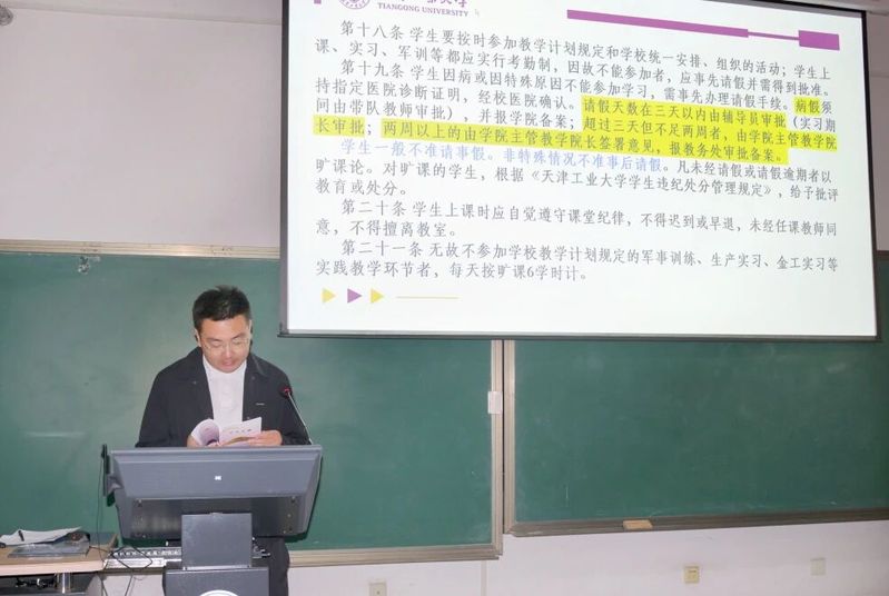辅导员袁子杰老师围绕多维度内容进行分享。首先他聚焦校园日常管理,带领学习公寓管理规定、违纪处分、本科生综合素质评价等相关制度规定,强调遵守校规校纪是保障校园秩序、顺利完成学业的重要前提。接下来袁子杰老师从成长发展角度建议同学们全面发展,珍惜舍友情谊、共建良好学习生活环境,同时介绍应征入伍政策,为有志参军者提供指南。