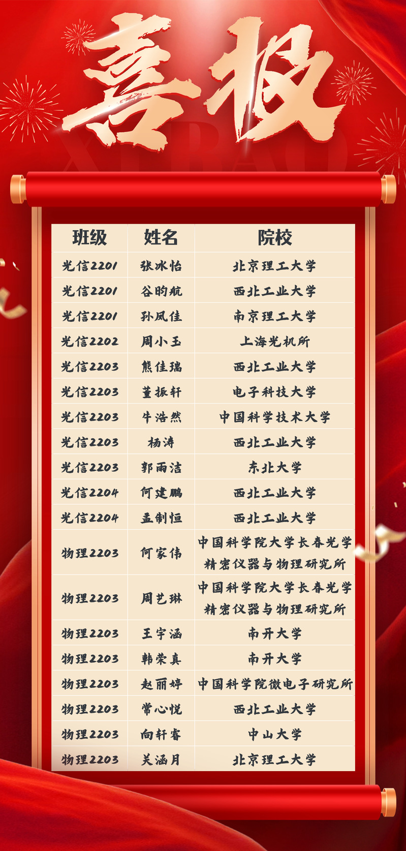 用智慧点亮未来,以拼搏铸就梦想。2026届19名同学成功推免保研到理想的高校,其中,有11名同学来自光电信息科学与工程专业,有8名同学来自应用物理学专业。