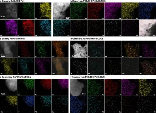 高熵合金作为一类特殊合金,通常由五种及以上金属元素按5%至35%的比例构成,其多元元素组合赋予了晶格畸变效应、缓慢扩散效应和鸡尾酒效应等独特特性,进而具备优异的催化活性、耐腐蚀性、热稳定性与化学稳定性。近年来,颗粒尺寸低于2nm的亚纳米级高熵合金因能大幅提升贵金属利用率,成为研究热点。然而,传统合成方法存在加热与冷却速率慢(每分钟仅数十摄氏度)的瓶颈,易导致合金相分离形成异质结构,还会引发纳米颗粒团聚;即便近年开发的焦耳热、微波加热法突破了部分热力学极限,仍难以制备出亚纳米级高熵合金。该研究精准解决了上述难题。他们先将金纳米颗粒分散在含多种金属盐的溶液中,再用纳秒脉冲激光对其辐照,借助激光激发的金纳米颗粒等离激元效应,使颗粒表面温度快速升至2000℃以上,并以高于1010℃/s的速度冷却,最终批量获得平均尺寸仅1.8nm、各元素均匀分布的亚纳米级高熵合金纳米颗粒。该合金作为电解水催化剂时,酸性条件下的产氢、产氧活性及稳定性,均显著优于商业铂碳催化剂与二氧化钌催化剂。